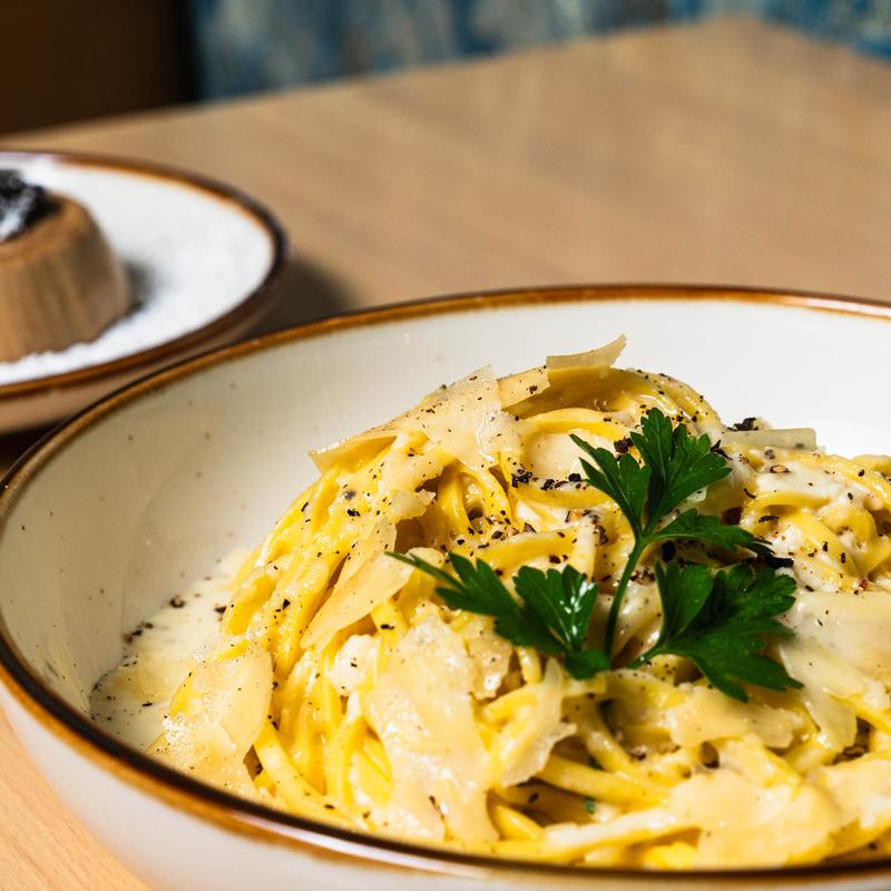 Spaghetti, 12-month aged pecorino, fresh black pepper, EVOO.