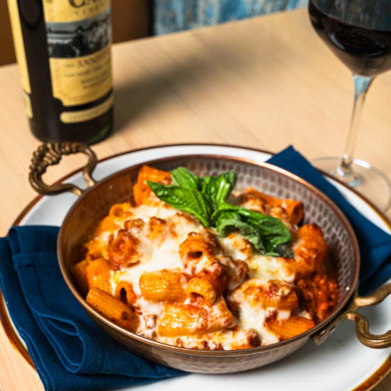 Paccheri, bolognese sauce, pecorino bechamel, 12-month aged parmesan, mozzarella.
