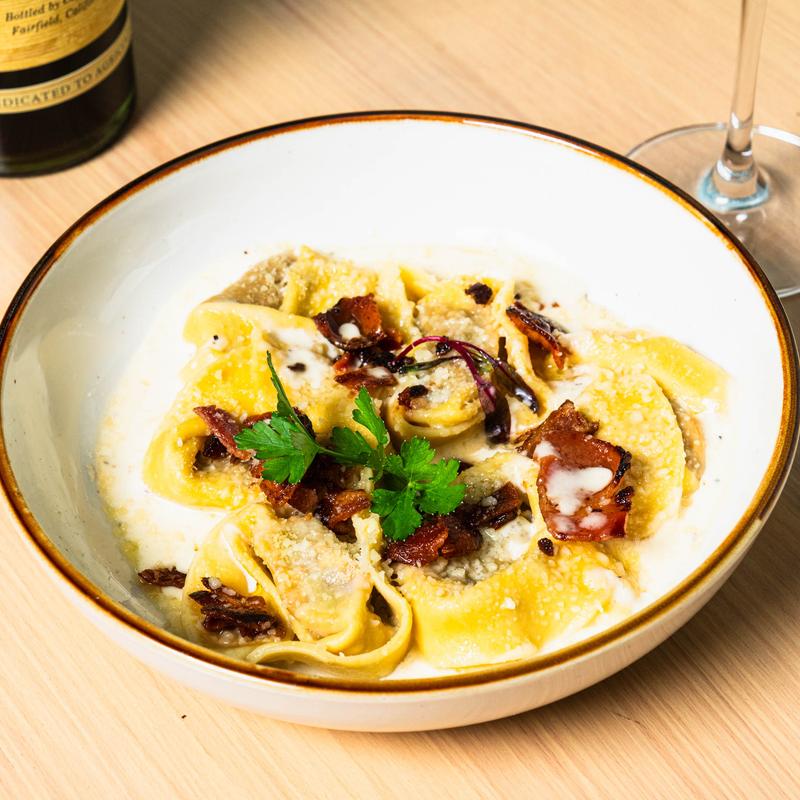 Braised short rib filling, pecorino brown butter, parmigiana sauce, pancetta, crispy prosciutto.