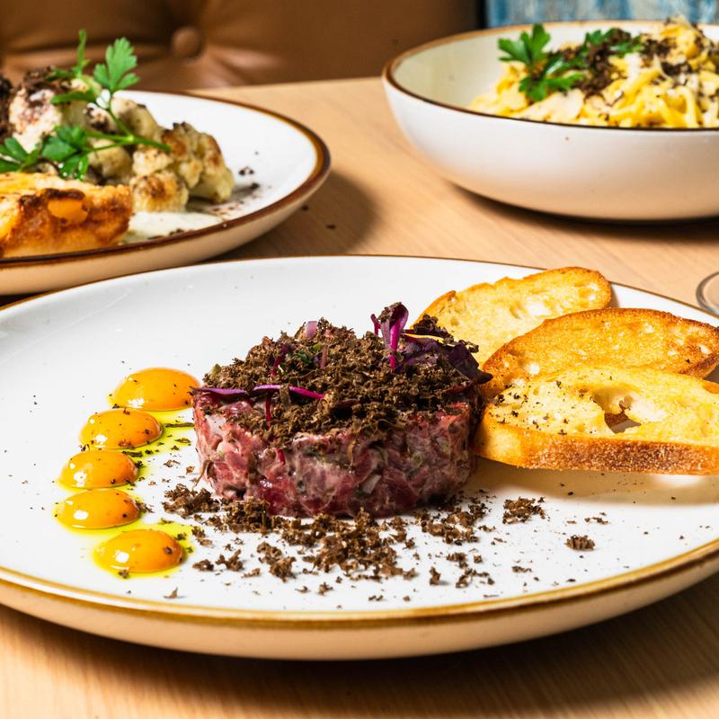 Piemontese beef, meyer lemon aioli, Calabrian chili, capers, EVOO.