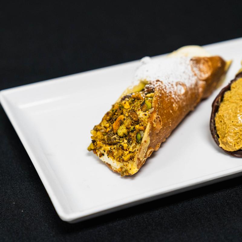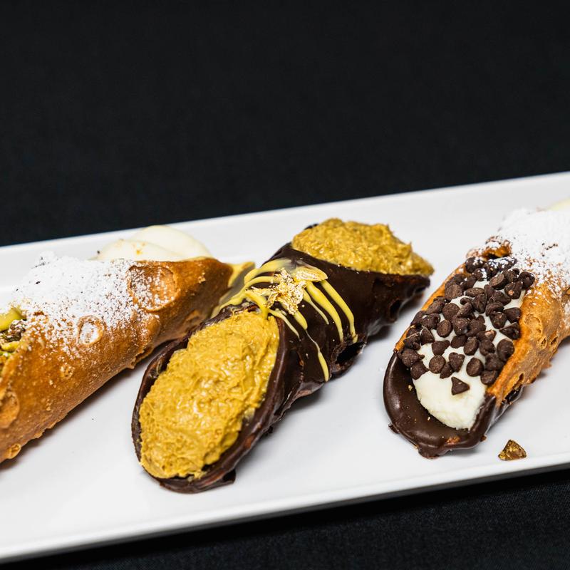 Two crushed cannoli shells filled with Sicilian ricotta, pistachio crushed or chocolate chips.
