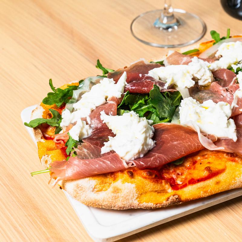 Mozzarella, cherry tomatoes, San Daniele prosciutto, arugula.