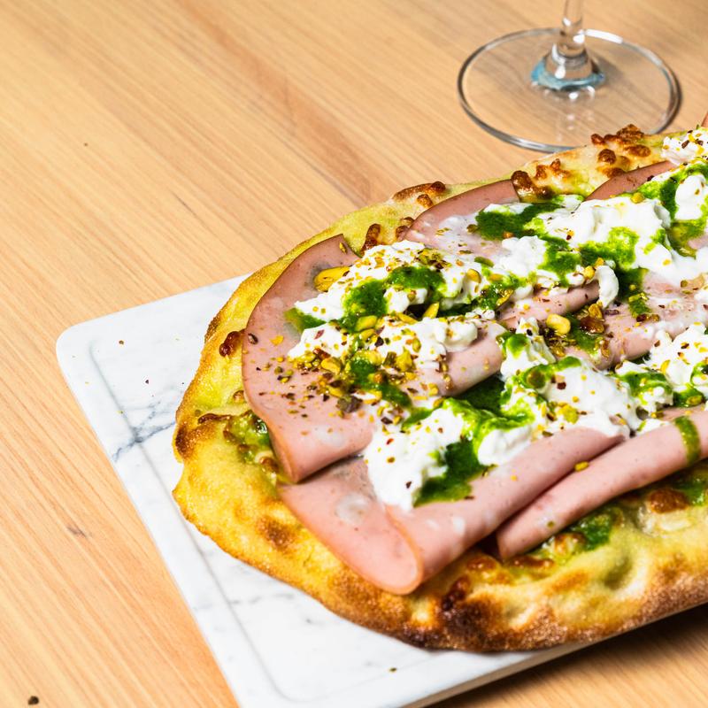 Mozzarella, mortadella al pistacchio, stracciatella, crushed pistachio, basil pesto.