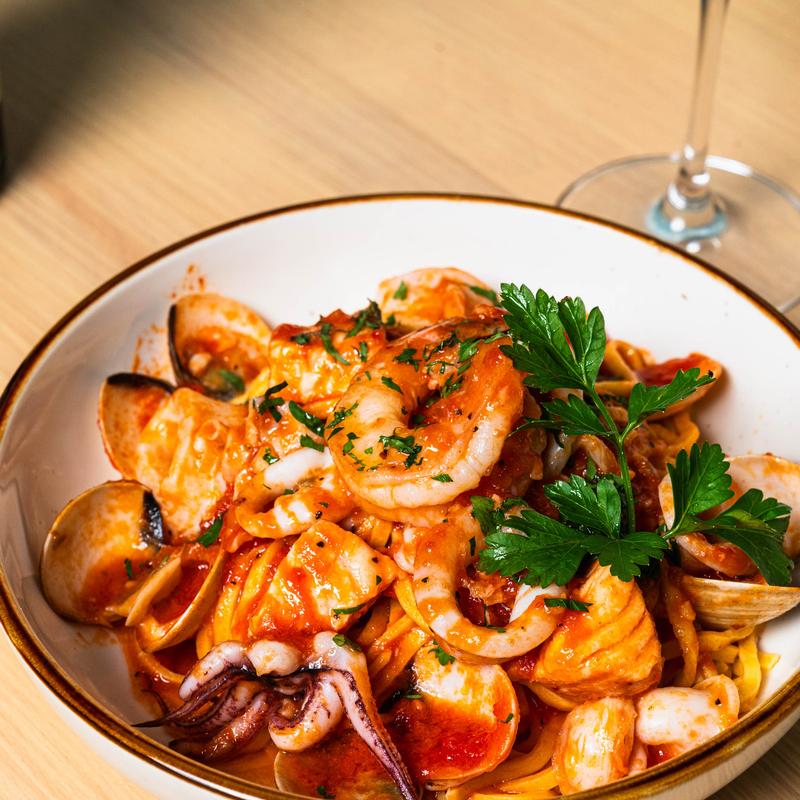 Linguine, shrimp, clams, salmon, lobster, calabrian citrus, pomodoro, EVOO.