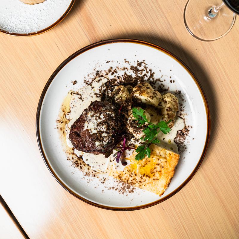8oz filet mignon, Yukon gold potato gratin, roasted cauliflower florets, brandy mustard cream sauce, black truffle crust.